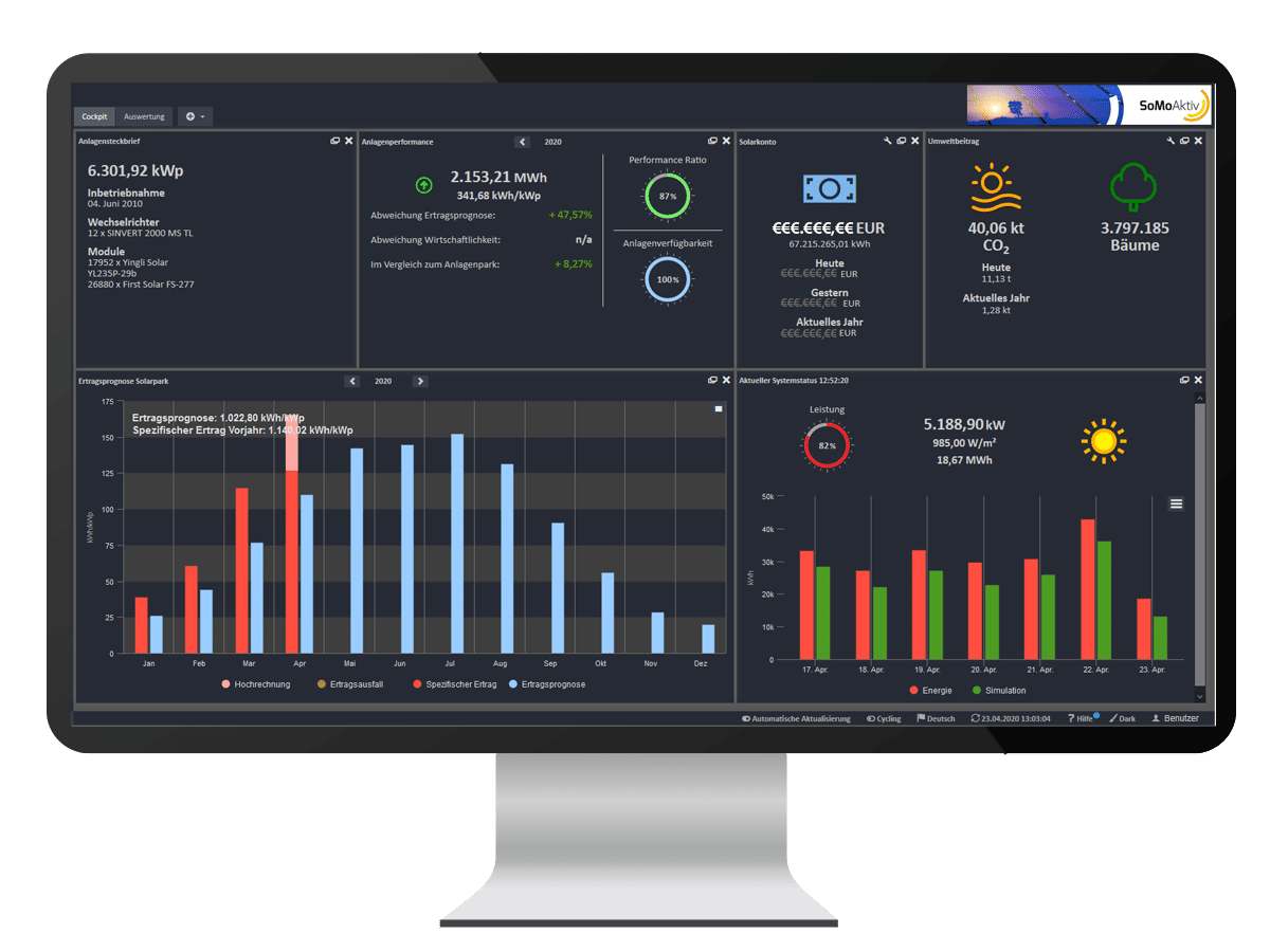Zu jedem Zeitpunkt und mit einer minütlichena utomatischen Aktualisierung werden Fehlermeldungen und Störfälle sofort sichtbar, die effizient und schnell durch uns gelöst werden. Mit einer eigens für die SoMoAktiv GmbH entwickelten webbasierten Benutzeroberfläche können unsere Kunden ihr PV-Portfolio überall und auf allen Geräten verfolgen.