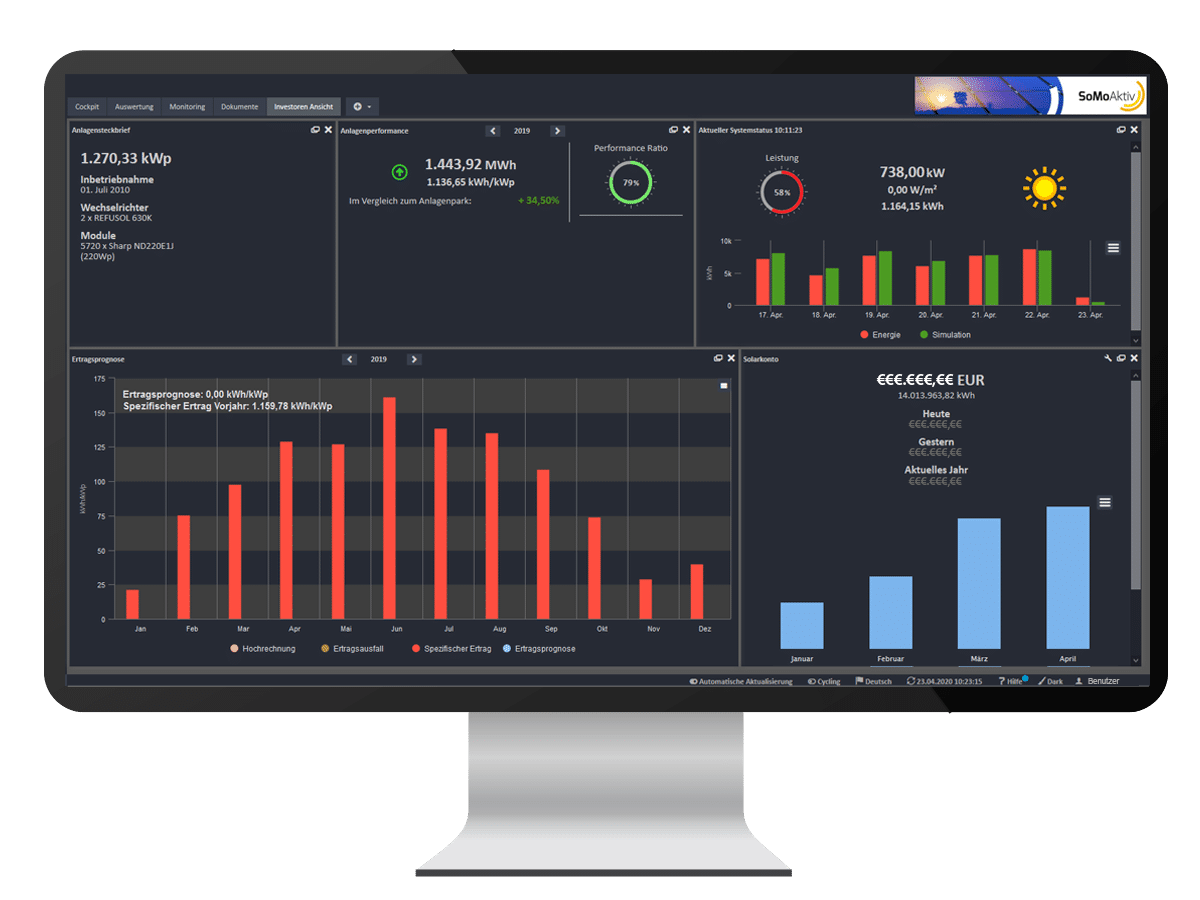 Jede PV Anlage erfordert eine kontinuierliche Überwachung von Parametern, die wir komplett automatisch aufzeichnen. Dabei stellen wir für unsere Kunden über eine Investorenansicht im Online Portal der SoMoAktiv alle Daten visuell aufbereitet zur Verfügung. Was unser Portal Ihnen bietet: